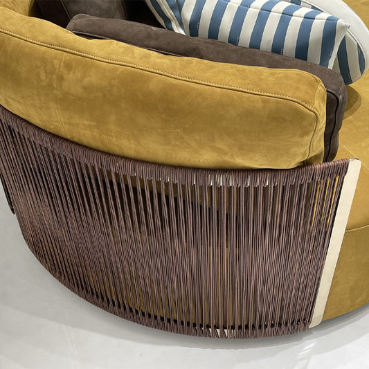 Orange brushed leather stainless steel armrests and backrest chair with woven bottom detail